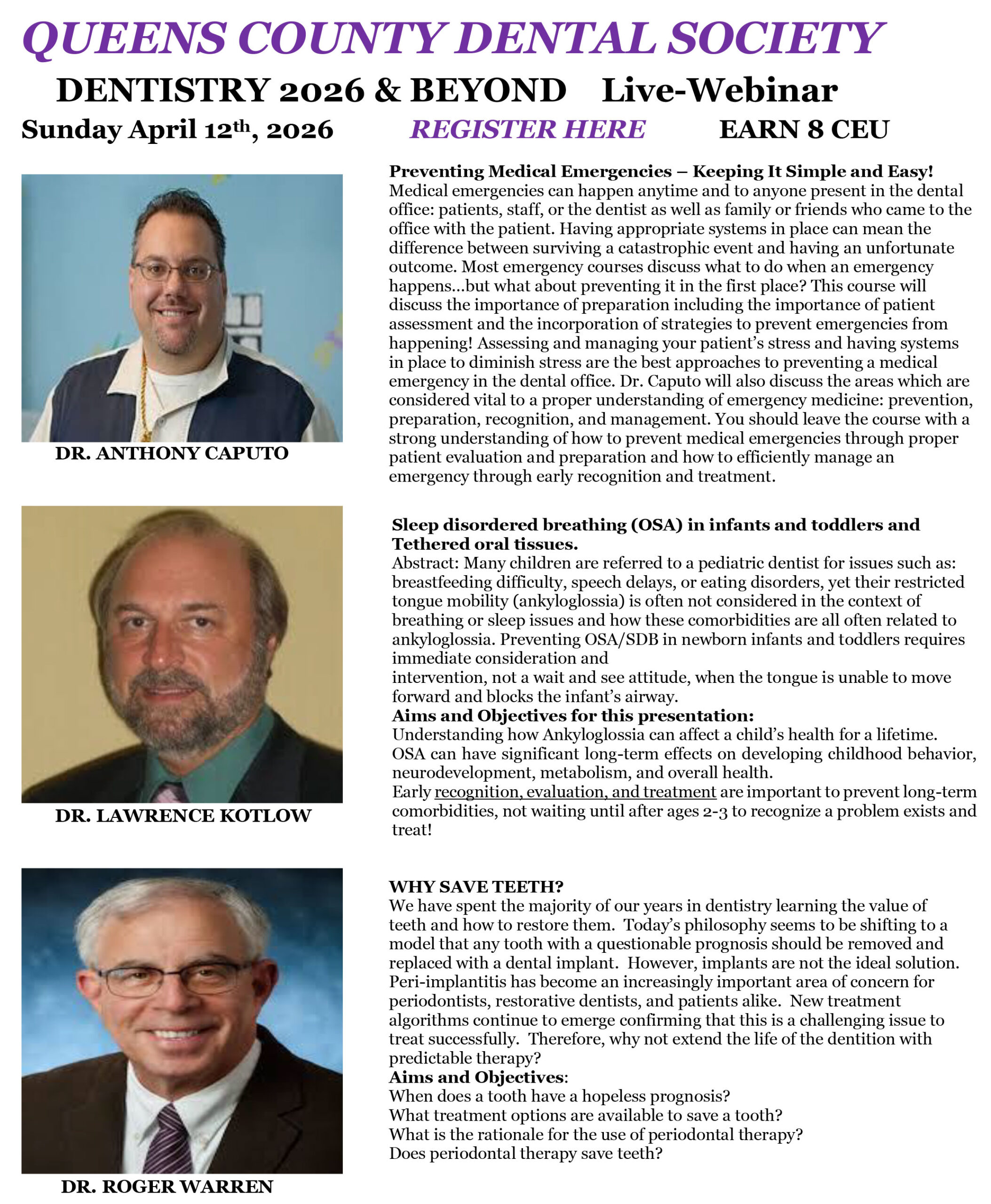 Queens County Dental Society Designated this Activity for 4 CEU (NYSDA 166, AGD 148) DATE/TIME Sunday, February 8th, 2026 Lecture 8:00am-12:00PM LOCATION THIS CLASS WILL BE OFFERED AS A LIVE WEBINAR COURSE TITLE/DESCRIPTION “Mandated Infection Control” Re-licensure* *A NYS DEPT